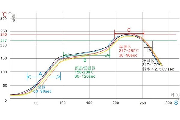 焊接區(qū):焊接區(qū)的溫度從217度到260度,升溫斜率應在2度/秒,升溫時間60~90秒;